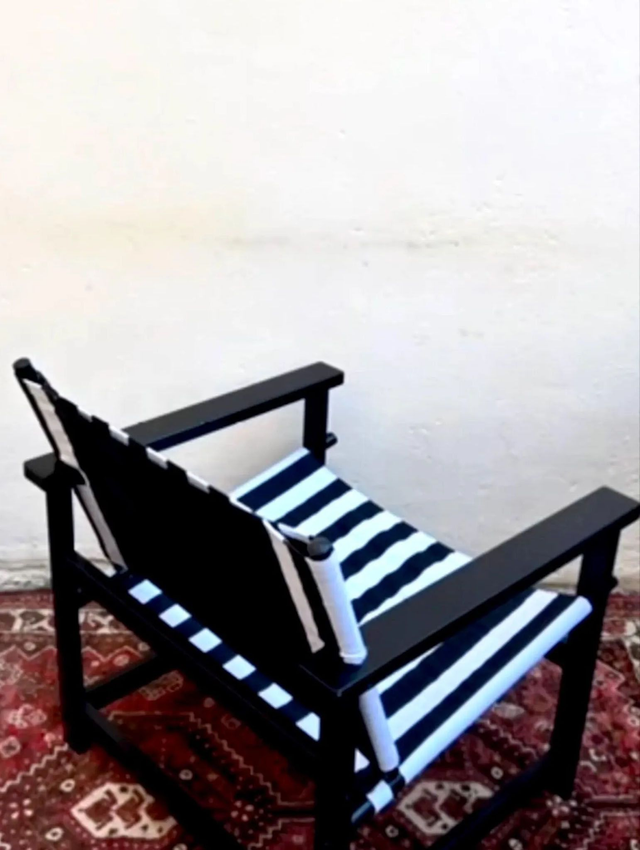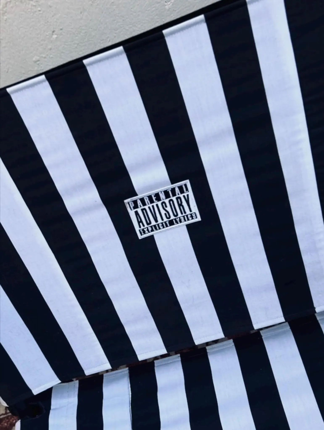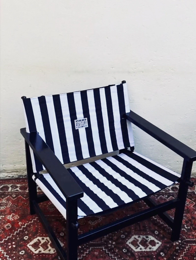 il a été upcyclé est retapissé à Marseille avec un tissu rayé Noir et blanc issu de la récupération & le logo Parental advisory.